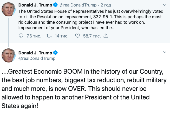 «Импичмент вашего президента, который возглавлял величайший экономический бум в истории нашей страны, лучшие показатели работы, самое большое снижение налогов, восстановление вооруженных сил и многое другое, теперь закончился. Этого никогда не должно случиться с другим президентом Соединенных Штатов снова», — написал Трамп.