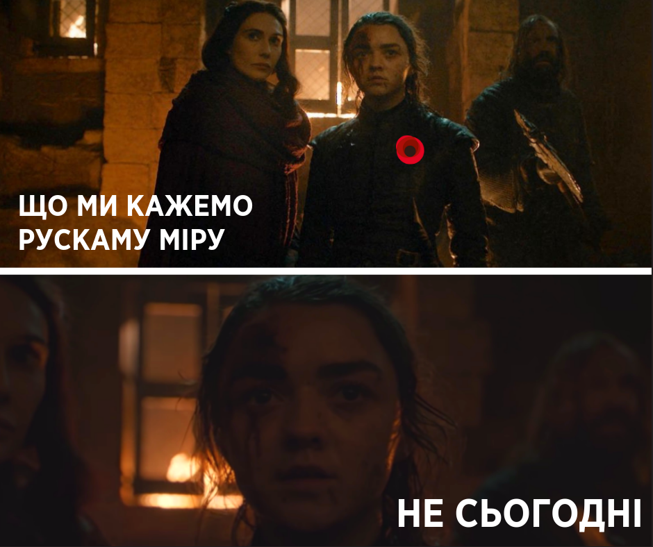«В окопах и воинских частях, аудиториях и классах, кабинетах и операционных, на улицах и в собственных домах, в коридорах и в парках, в клубах и в церквях, на телепрограммах и в разговорах с друзьями в кафе, в пабах и на стадионах — каждый и все мы здесь можем и должны сегодня и каждый день говорить русскому миру очень простые слова: не сегодня», — заключила она.