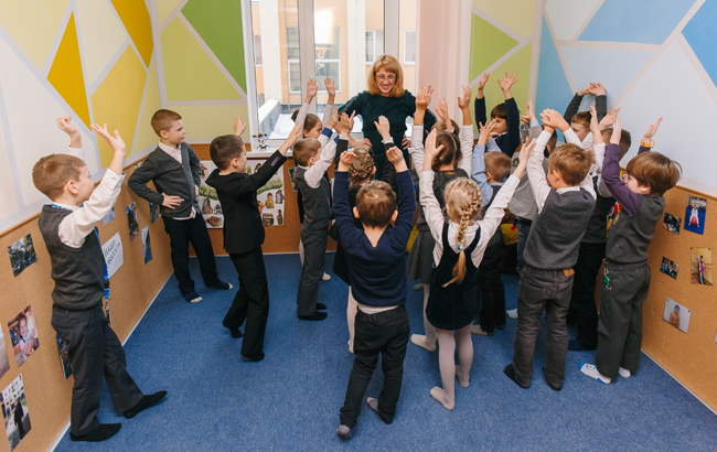 Школа і виглядає по-іншому. М’які панелі на стінах являють собою демонстраційні площини для учнівських досягнень. Але які з них тут розміщувати – вибирає сама дитина. Кольорові наклейки на шкільній підлозі допомагають учням освоїти смисли у русі. Наприклад, вивчити кольорову гаму, граючи у класики.