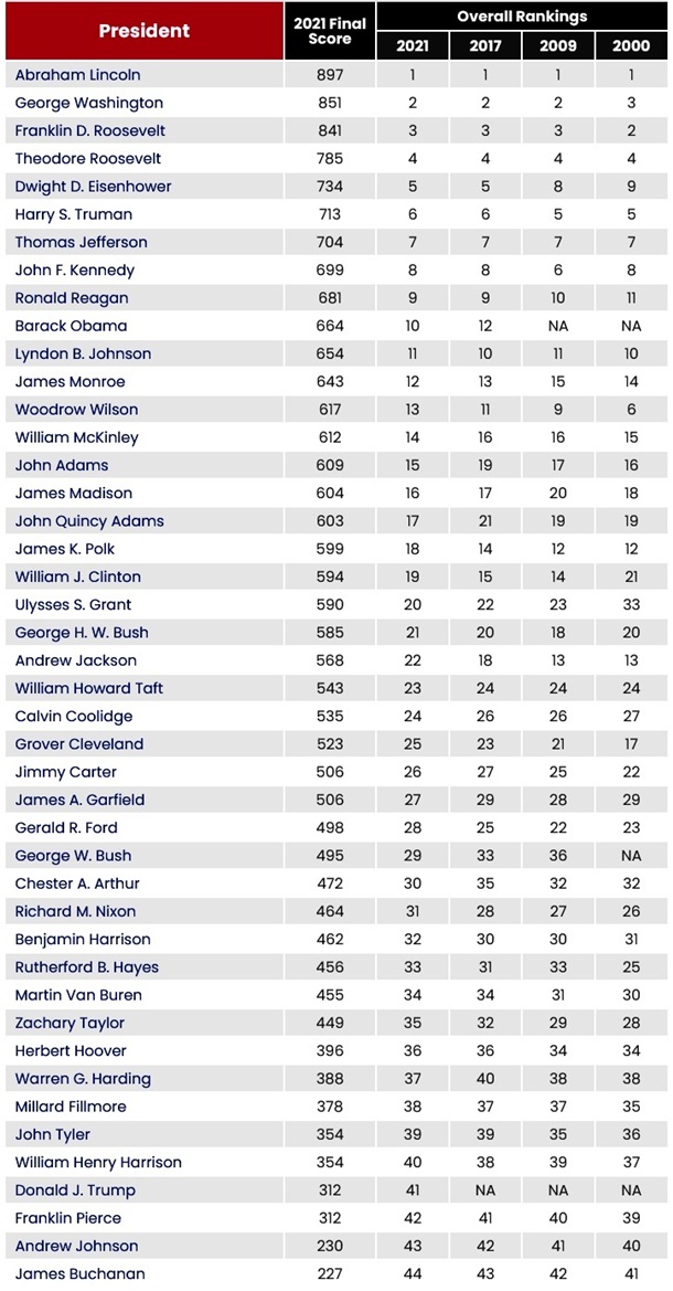 Історики, які складали президентський рейтинг, керувалися 10 критеріями: моральний авторитет, кризове лідерство, економічне управління, адміністративні навички, бачення порядку денного тощо.