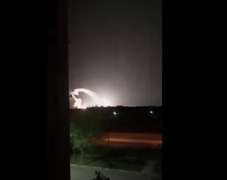 Как видно на видео, после взрывов на военном аэродроме занялся масштабный пожар.