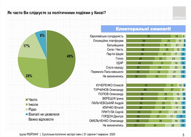 Кроме того, в Киевсовет проходят: партия Победа Пальчевского — 6,9%, Оппозиционная платформа — За жизнь — 6,8%, Голос — 6,5%, Батькивщина — 6,4%, Сила и честь — 5,5%. Около 13% опрошенных еще не определились.