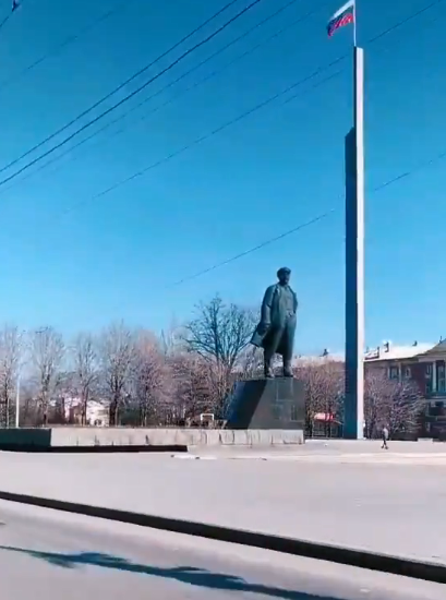 На снимке запечатлен один из проспектов города. На нем практически не видно людей и машин, несмотря на погожий день. Единственное, что видно из окна проезжающего авто, – это памятник Ленину и флаги России, которая оккупировала украинский город.
