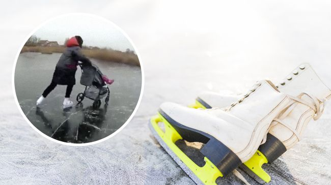Взрослые по очереди промчались замерзшем водоемом на коньках, толкая перед собой коляску со своей маленькой дочкой. При этом они все записывали на видео. Об этом сообщает ТСН.