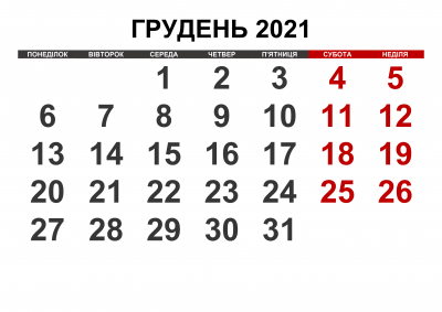 В декабре 2021 нас ждет дополнительный выходной в связи с празднованием Рождества Христова по юлианскому календарю, 25-го числа. Также мы отметим День вооруженных сил Украины, любимый праздник всех деток — День святого Николая, милый праздник — День объятий, Екатерины, Андрея, Варвары и многие другие важные даты.