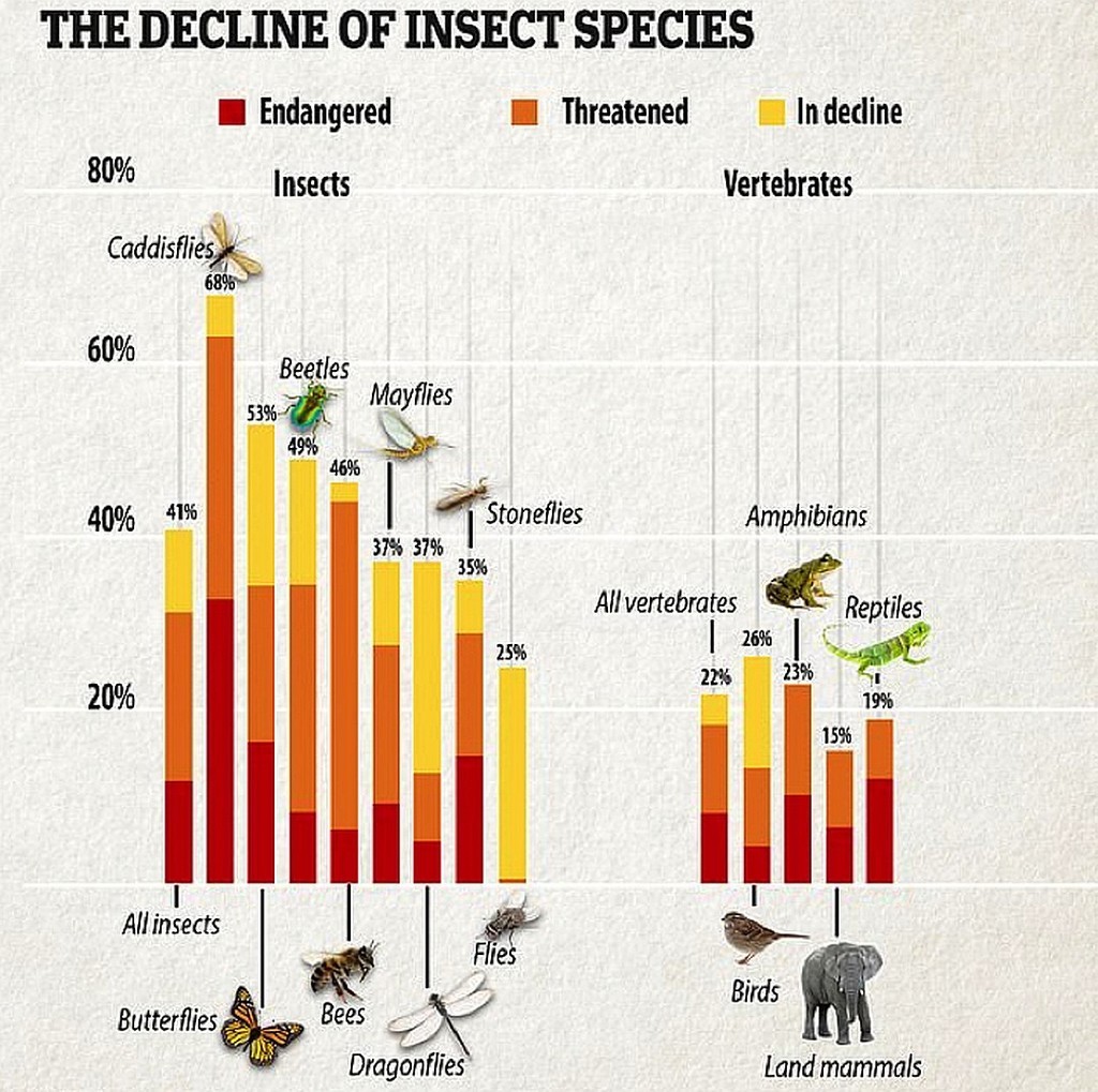 Специалисты предрекают цепную реакцию: исчезнут насекомые, умрут с голоду животные, которые ими питаются — рептилии, земноводные, птицы, погибнут растения — некому будет их опылять. За растениями последуют травоядные, за ними — хищники. Так все и вымрут вслед за насекомыми — и люди в том числе, поскольку им тоже будет нечем питаться.