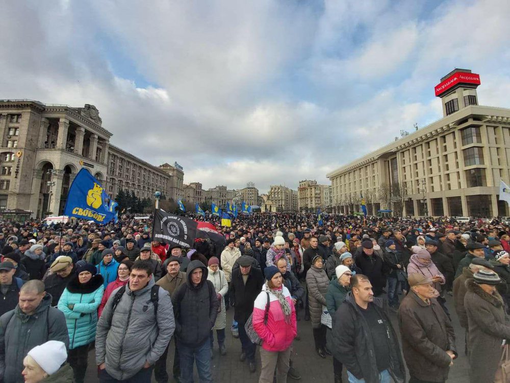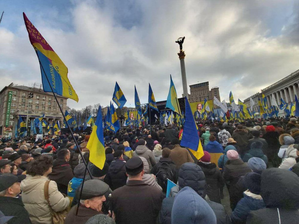На головну площу зійшлися близько 2 тис. активістів. Люди тримають прапори України і політичних сил – “Батьківщини”, “Свободи” і “Європейської солідарності”. По обидва боки від сцени розміщені великі написи “Червоні лінії для Зе”.