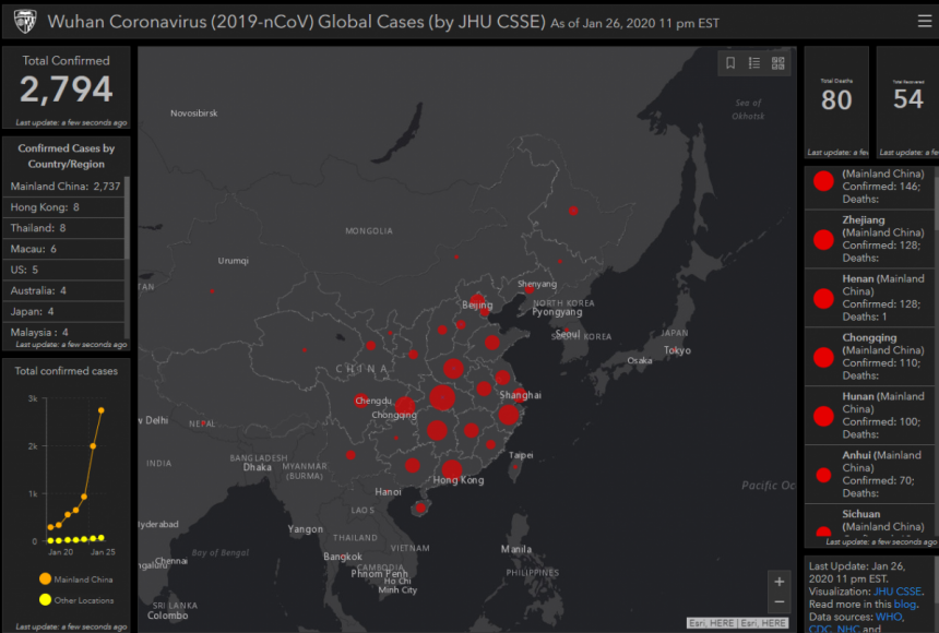 Дослідницький центр системних наук та інженерії Університету Джонса Хопкінса в США створив онлайн-карту, на якій в режимі реального часу можна відстежувати інформацію про поширення китайського коронавірусу 2019 nCoV.