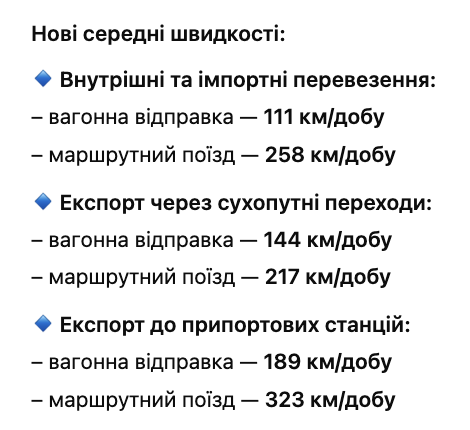 Згідно з коментарем заступника директора департаменту перевезень Валерія Ткачова, нові швидкісні показники набудуть чинності вже з 16 червня. Зміни стосуватимуться вагонів філії «Центр транспортної логістики» та охоплюватимуть внутрішні, імпортні та експортні перевезення.