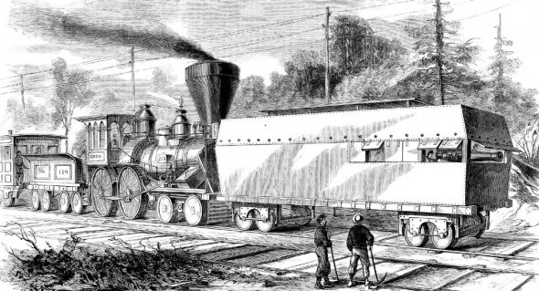 Перші бронепоїзди з’явилися ще під час Громадянської війни в США в 1861-1865 роках. Перший такий поїзд, обшитий бронею був створений з ініціативи генерала Джозефа Хукера. Він хотів транспортувати на таких потягах солдатів. Тоді ж на поїзди спробували ставити озброєння.