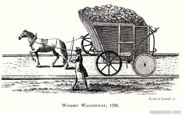 Перша кінна залізниця з регулярними пасажирськими перевезеннями виникла в 1807 році у Великобританії. Але ще за два століття до цього рейкова дорога з вагонетками, запряженими кіньми, почала возити вугілля в Англії між двома гірничими селищами. Візок супроводжували погоничі тягових тварин. Дорога отримала назву “Wollaton Wagonway”.