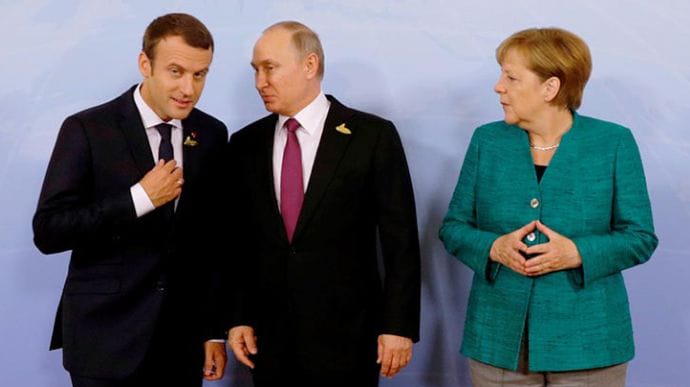 Президент Франції Еммануель Макрон, канцлерка Німеччини Ангела Меркель та президент РФ Володимир Путін провели переговори у форматі…